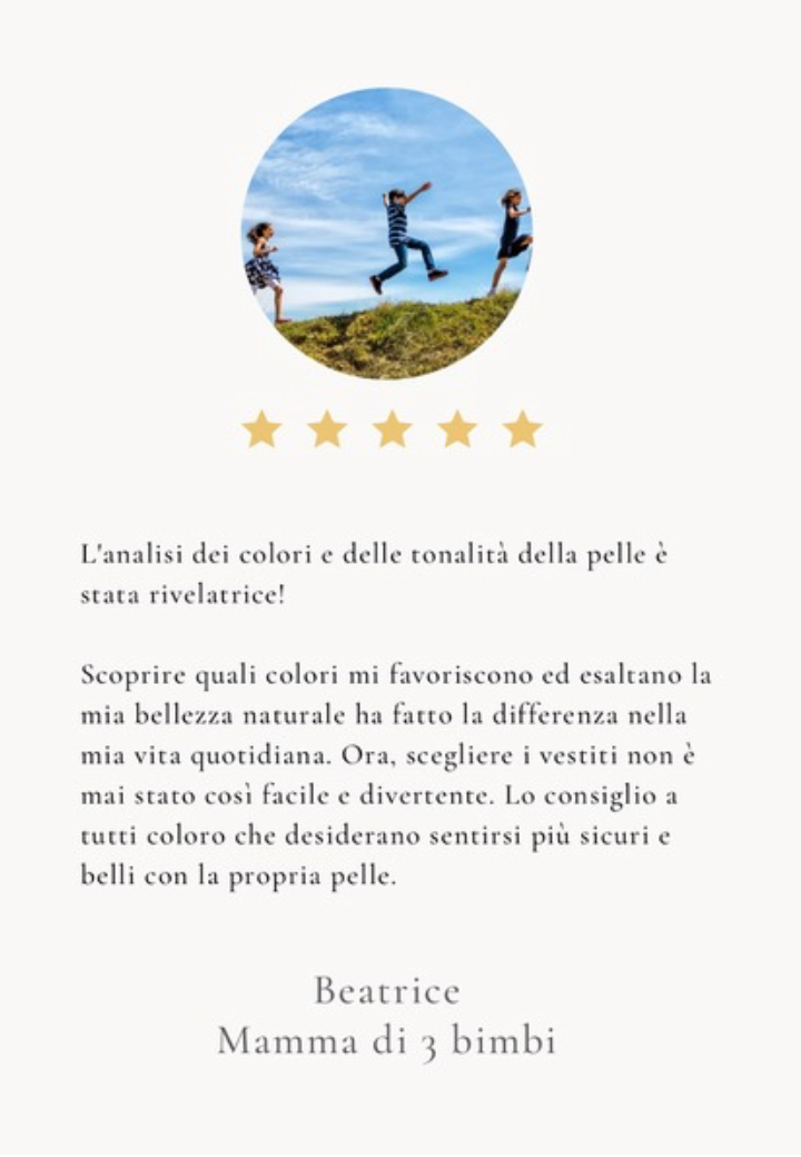 Alla fine di questo viaggio, non solo conoscerai i colori che ti valorizzano di più, ma avrai anche la consapevolezza di come ogni scelta possa riflettere la tua unicità e il tuo potere personale. Preparati a trasformare la tua immagine e a sentirti finalmente autentica, perché ogni donna merita di brillare nella propria verità..