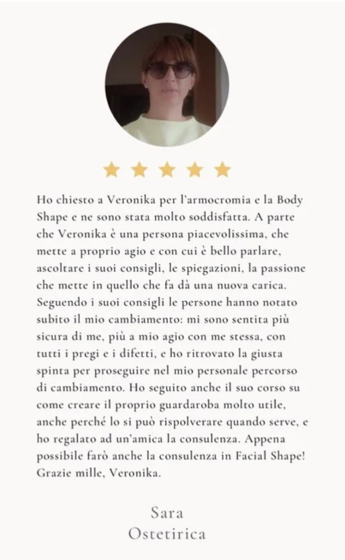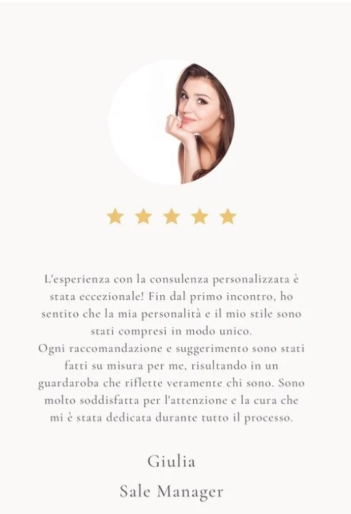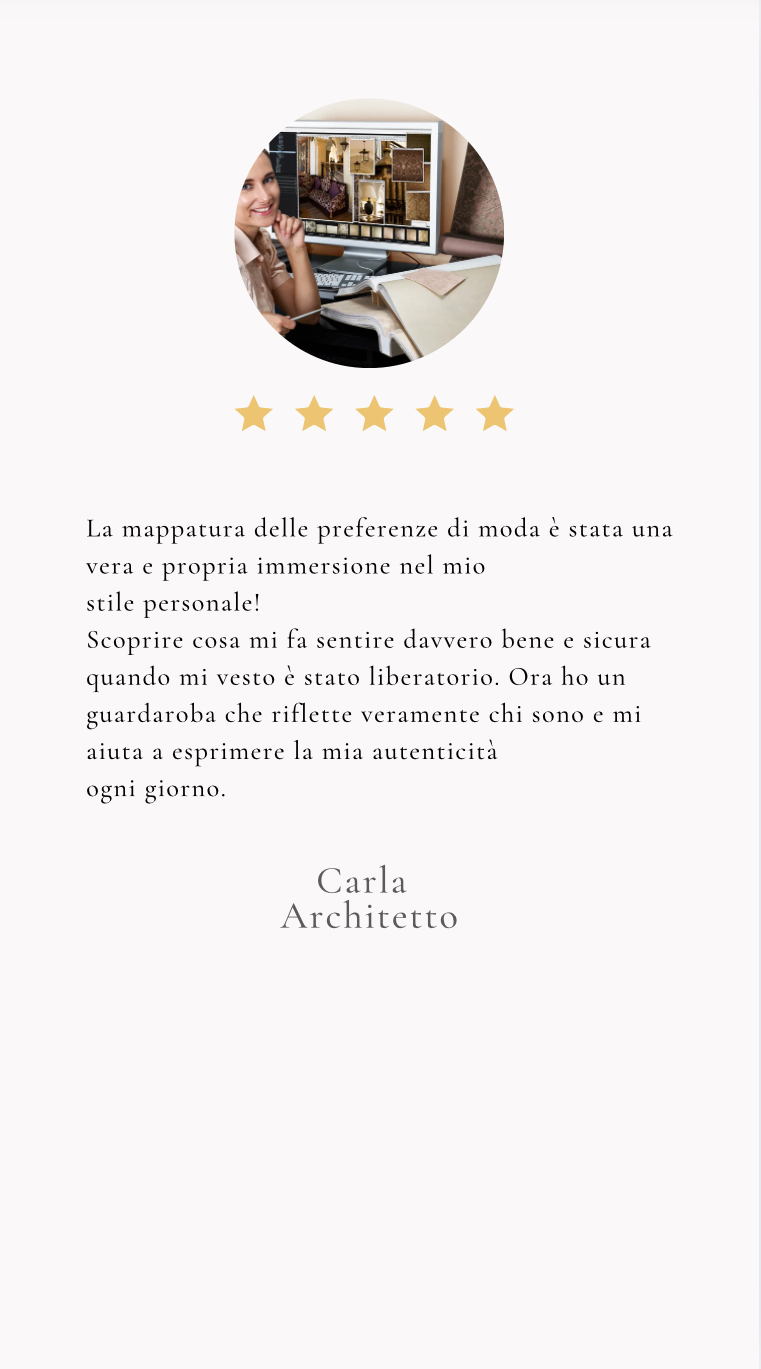 Immagina di sentirti sicura e autentica ogni volta che indossi un capo. Questo servizio ti guiderà in un viaggio affascinante attraverso i 7 stili universali, aiutandoti a riconoscere quello che risuona profondamente con la tua essenza. Non si tratta solo di moda, ma di un'opportunità per esprimere chi sei veramente e per celebrare la tua individualità.