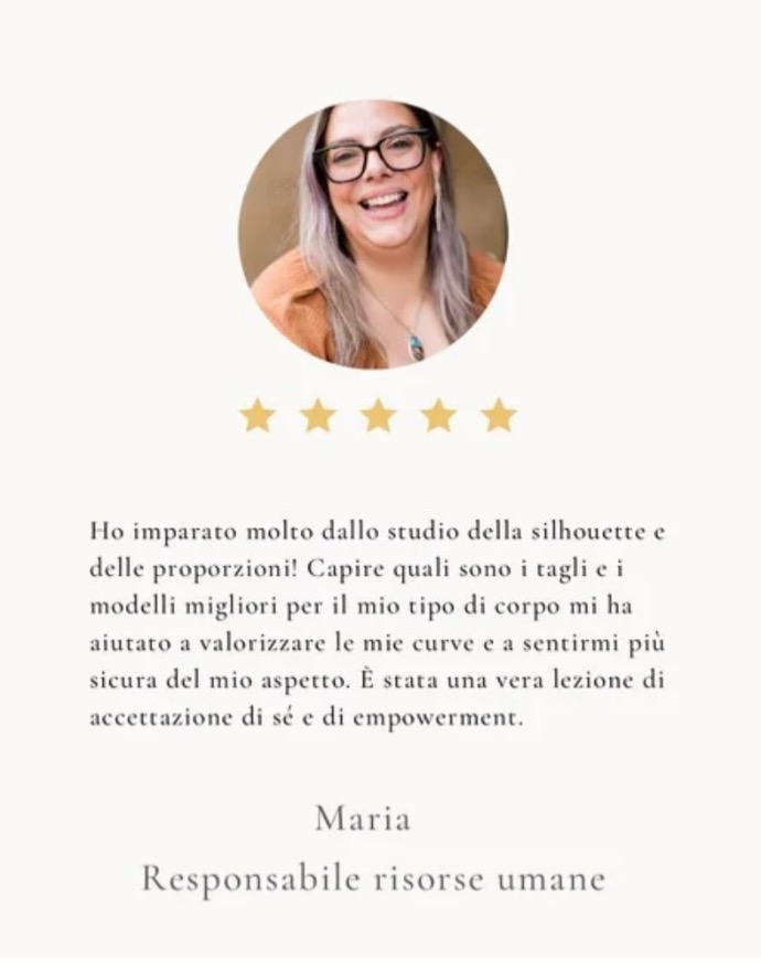 Ogni donna merita di sentirsi sicura e radiosa, e io ti guiderò in un percorso che va oltre il semplice abbigliamento. Con tecniche pratiche e suggerimenti mirati, imparerai a camuffare ciò che non vuoi mettere in evidenza e a mettere in risalto ciò che ami di più di te stessa.