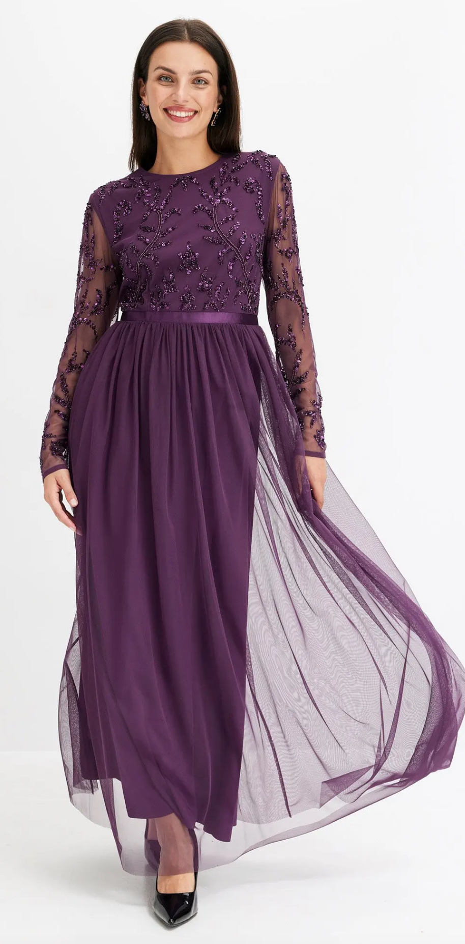 Tacchi sottili o décolleté a punta possono slanciare visivamente la figura. Usa gioielli verticali, come lunghe collane, per allungare il busto, evitando accessori che tagliano orizzontalmente il corpo.