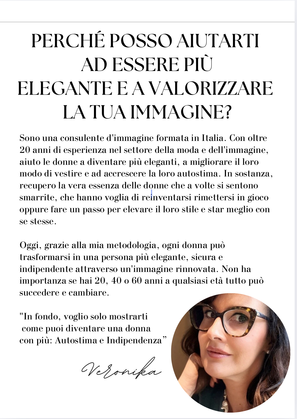 Ogni donna merita di sentirsi sicura e radiosa, e io ti guiderò in un percorso che va oltre il semplice abbigliamento. Con tecniche pratiche e suggerimenti mirati, imparerai a camuffare ciò che non vuoi mettere in evidenza e a mettere in risalto ciò che ami di più di te stessa.