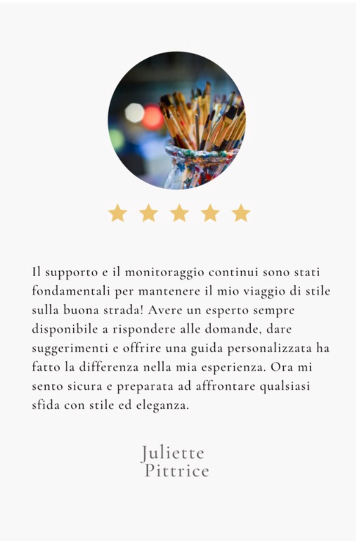 Immagina di sentirti sicura e autentica ogni volta che indossi un capo. Questo servizio ti guiderà in un viaggio affascinante attraverso i 7 stili universali, aiutandoti a riconoscere quello che risuona profondamente con la tua essenza. Non si tratta solo di moda, ma di un'opportunità per esprimere chi sei veramente e per celebrare la tua individualità.